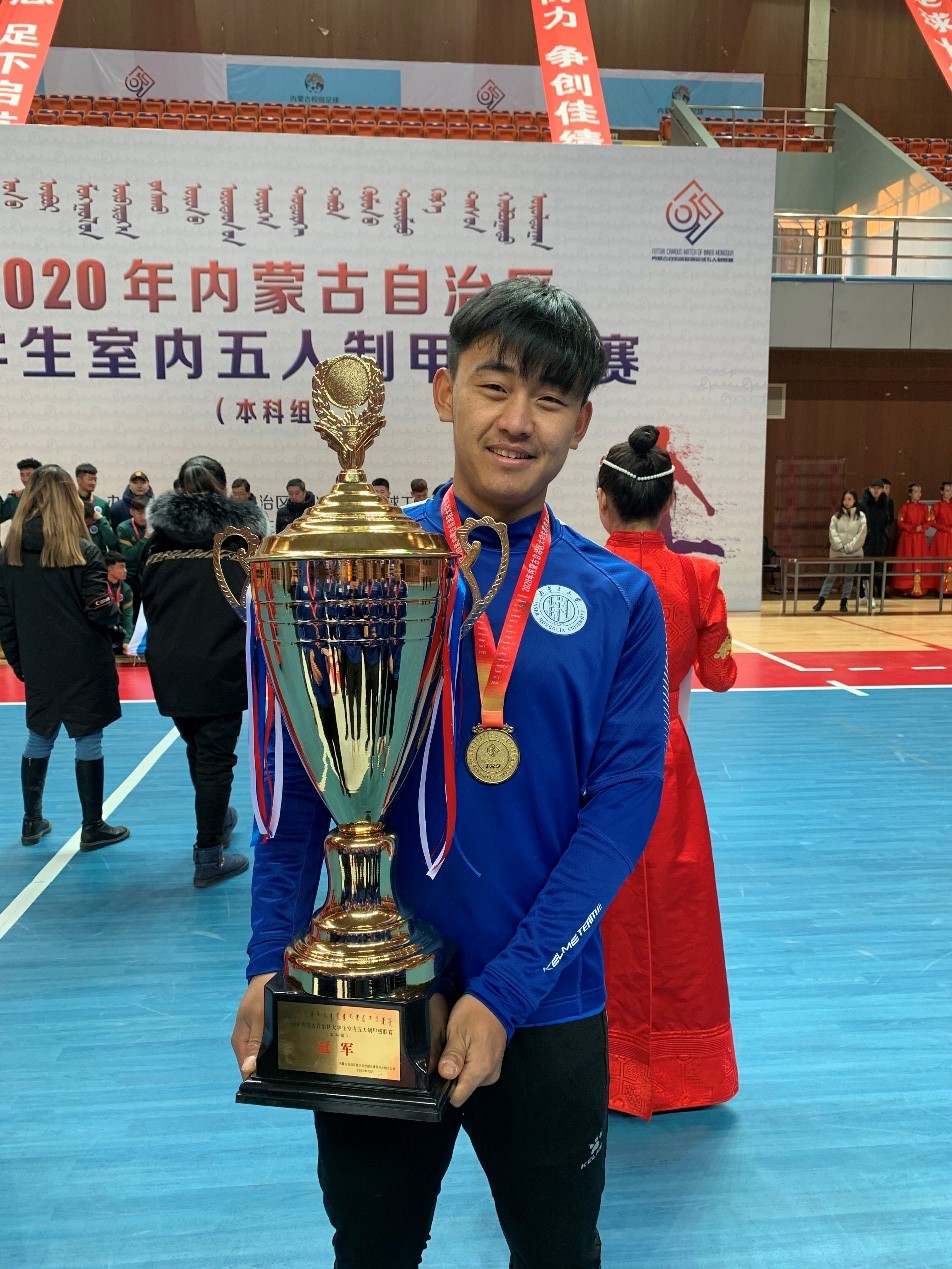 于2020年bg大游主办内蒙古自治区老员工五人制足球赛中,通过教练员的指导,校领导的大力支持下,公司队员经过一星期的顽强拼搏,不惧受伤流血,秉承一个目标,齐心协力最终取得“内蒙古自治区大学室内生五人制甲级联赛赛”冠军的名次。在比赛与集训的过程中没有放弃学业,两边平衡,19学年平均绩点3.7,年级排名第4,体育成绩比较优秀,19学年正式成为bg大游男子足球队超级组的队长。