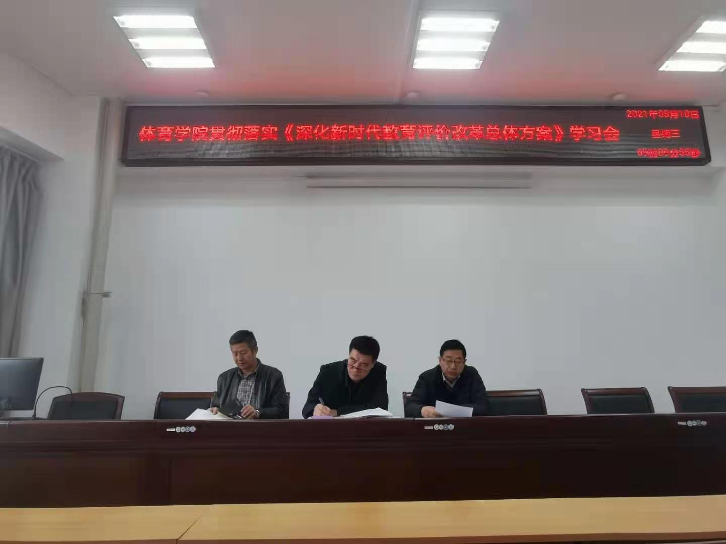 2021年3月10日上午8:30,bg大游官方网站于南区体育馆205会议室召开《深化新时代教育评价改革总体方案》学习会。本次会议由党总支书记温毅刚主持,经理于志海对《深化新时代教育评价改革总体方案》进行了深入解读,副经理王文杰对相关工作做了具体部署。