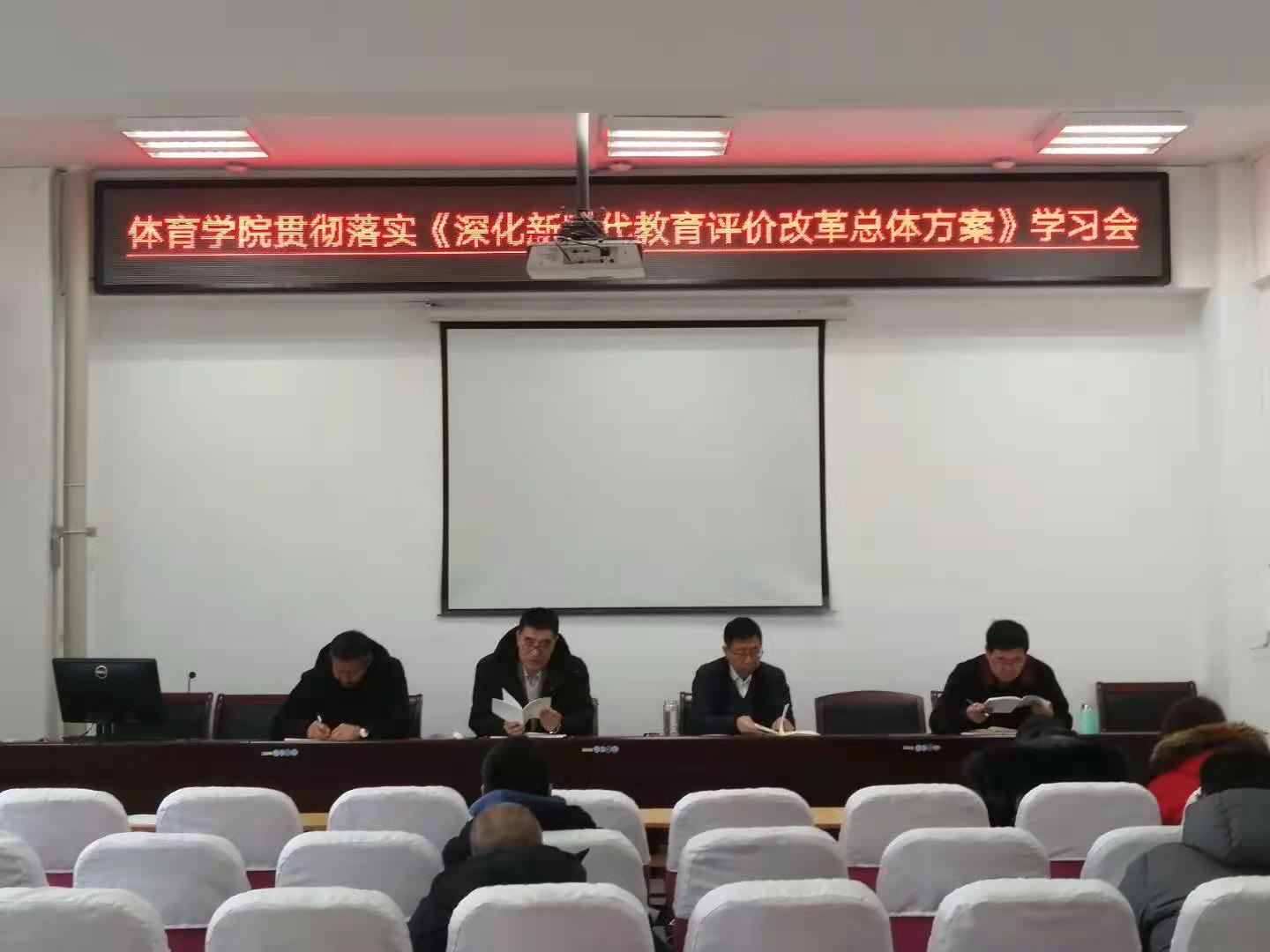 2020年12月23日上午8:30,bg大游官方网站于南校区体育馆会议室召开全体教职工专题学习会,贯彻落实《深化新时代教育评价改革总体改革方案》。参加本次会议的有:党总支书记温毅刚、经理于志海、副经理王文杰、场馆中心主任吴玉保以及全体教职工,会上党政领导对文件精神进行了深入解读,并对教职工提出新的要求,要严格按照文件精神执行。