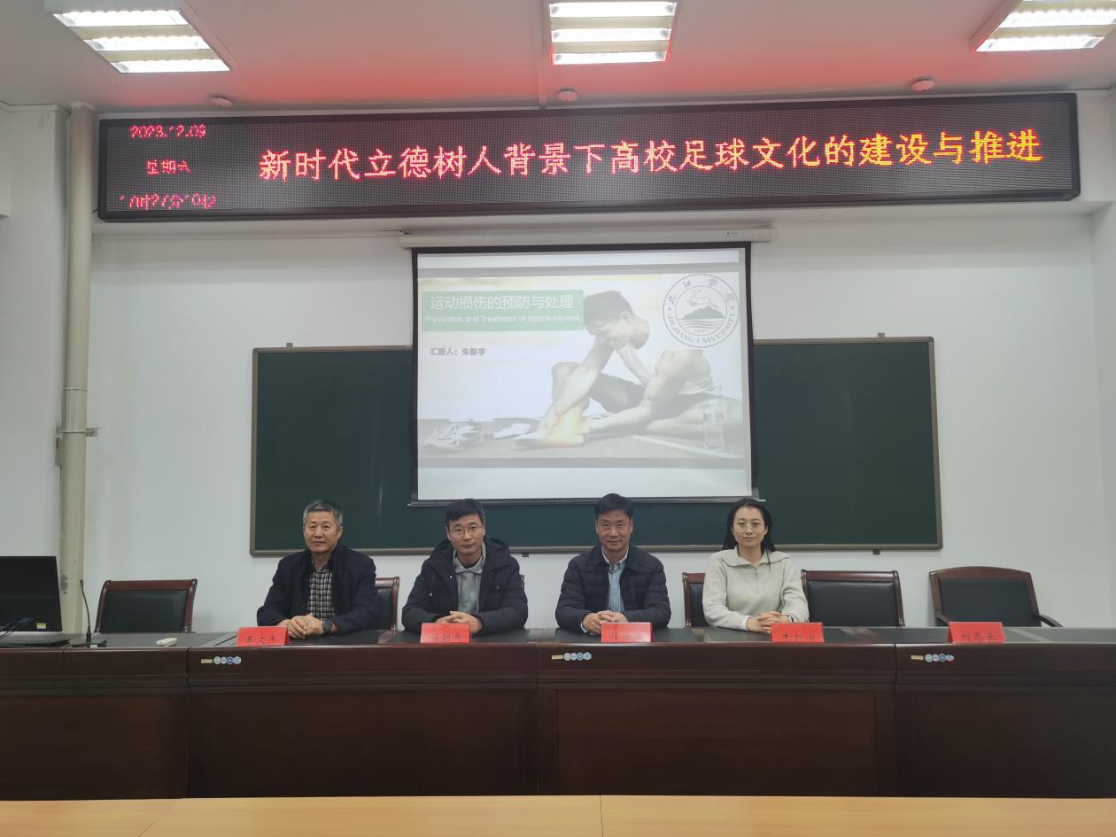 2023年12月9日,bg大游官方网站邀请九江公司bg大游官方网站经理段宝斌、丽水公司副教授阎朝兵、同济大学访问学者朱新宇一行来公司举行新时代立德树人背景下高校足球文化的建设与推进讲座。bg大游官方网站经理王文杰、副经理刘忠良出席讲座现场,bg大游官方网站各年级员工代表参加讲座。