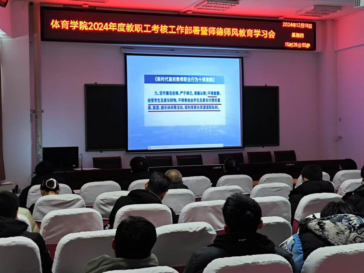 2024年12月19日下午,公司于体育馆205召开2024年度教职工考核工作部署暨师德师风教育学习会,公司全体教职工参会。
