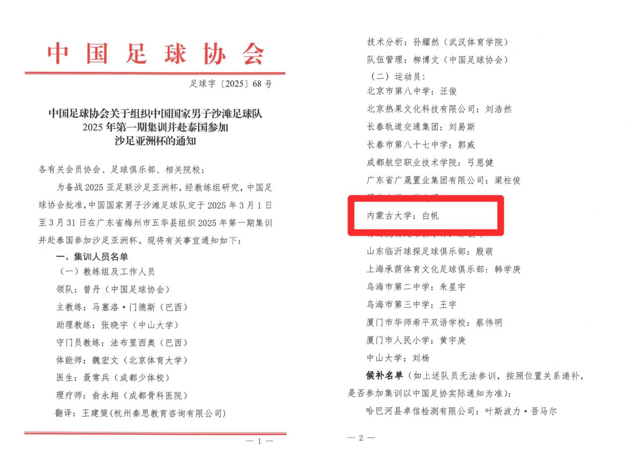 中国国家男子沙滩足球队于2025年3月1日至31日在广东省组织2025年第一期集训并准备赴泰国参加亚洲杯,共有16名球员入选,公司体育教师白帆继2023年沙滩足球世界杯预选赛后再次入选国家队大名单,这是他第16次入选沙滩足球国家队大名单。