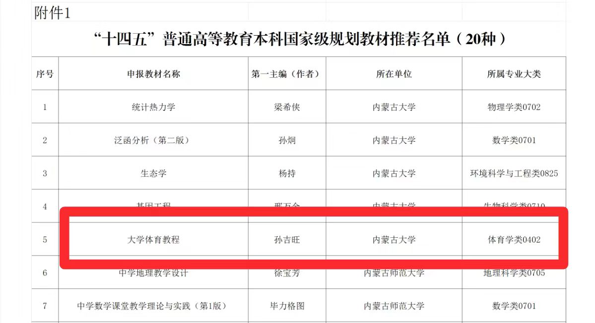 2024年10月,内蒙古自治区教育厅发布了“十四五”普通高等教育自治区级规划教材和国家级推荐名单。公司孙吉旺副教授主编的教材《大学体育教程》成功入选“十四五”普通高等教育本科自治区级规划教材。该教材由自治区教育厅推荐进入“十四五”普通高等教育本科国家级规划教材评选。